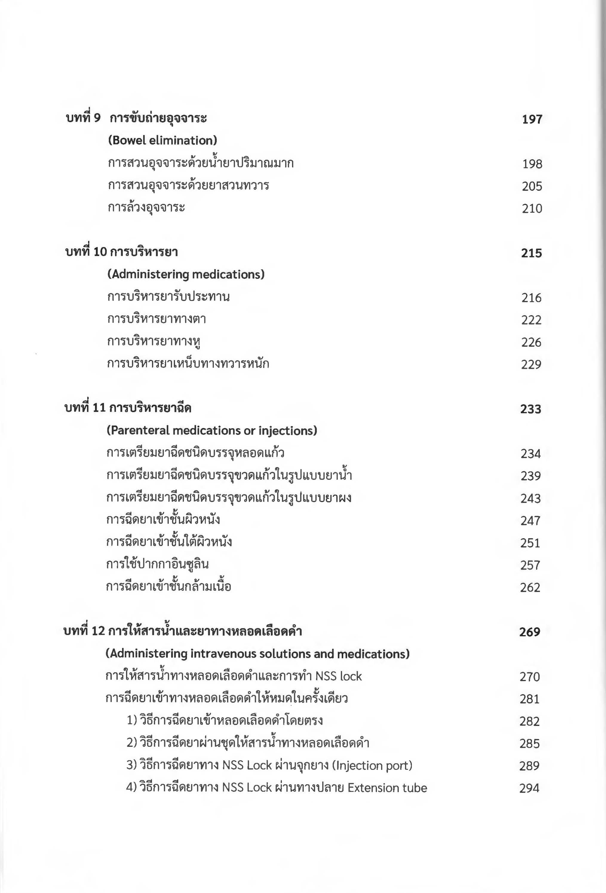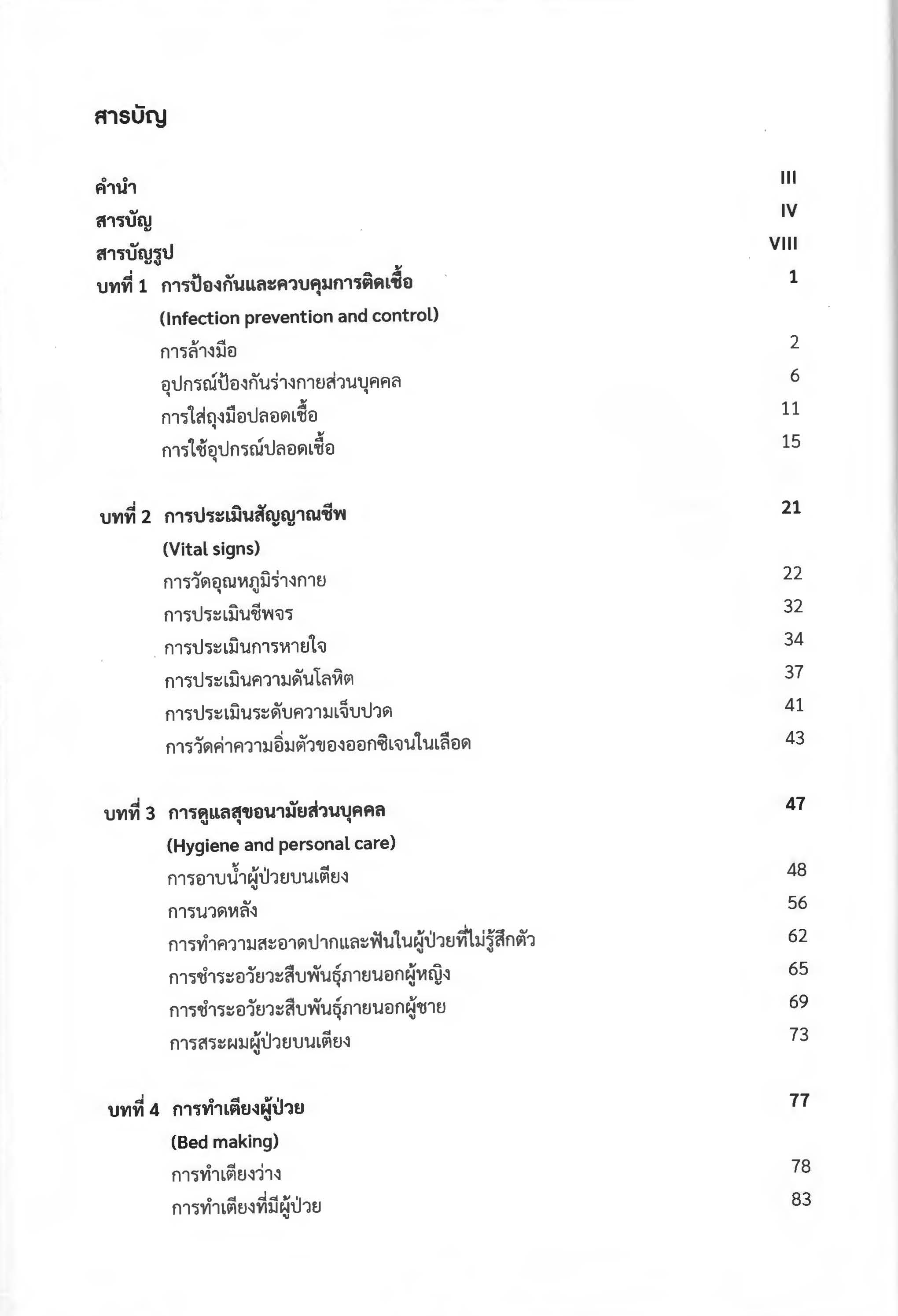 บทที่1 การป้องกันและควบคุมการติดเชื้อ- -บทที่2 การประเมินสัญญาณชีพ- - บทที่3 การดูแลสุขอนามัยส่วนบุคคล- - บทที่4 การทำเตียงผู้ป่วย- -บทที่5 การจัดท่าและการเคลื่อนย้ายผู้ป่วยอย่างปลอดภัย- -บทที่6 การให้อาหารทางสายให้อาหาร- -บทที่7 การให้ออกซิเจนและการดูดเสมหะ- -บทที่8 การขับถ่ายปัสสาวะ- -บทที่9 การขับถ่ายอุจจาระ- -บทที่10 การบริหารยา- -บทที่11 การบริหารยาฉีด- -บทที่12 การให้สารน้ำและยาทางหลอดเลือดดำ- -บทที่13 การทำแผล- -บทที่14 การประคบด้วยความร้อนและความเย็น
